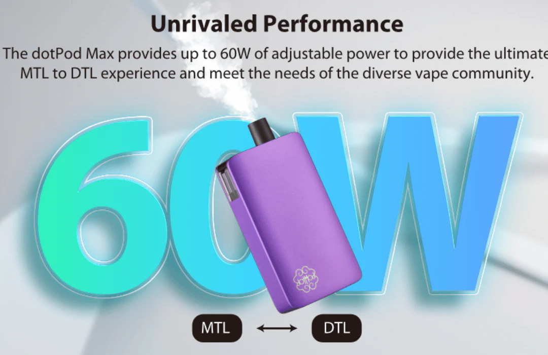 Il DotPod Max V1.5 Kit di DotMod è una pod mod regolabile con batteria integrata da 2100 mAh e potenza massima di 60 W, progettata per supportare sia svapo di guancia (MTL) sia semi-polmonare (RDL) grazie all’airflow regolabile sulla cartuccia. Il sistema integra un display a colori ad alta definizione per la visualizzazione delle impostazioni di svapo e permette l’attivazione tramite tiro automatico (auto-draw) o tasto Fire.