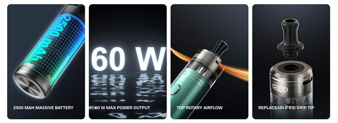 La cartuccia inclusa ha capacità di 5 ml ed è dotata di riempimento laterale (side-fill) semplice e pratico. Il sistema di flusso d’aria è regolabile dall’alto (top airflow), consentendo di modulare la resistenza al passaggio dell’aria in funzione della coil montata e dello stile di svapo desiderato.