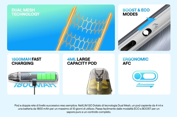 - Cartucce compatibili: serie NeXLIM Pod