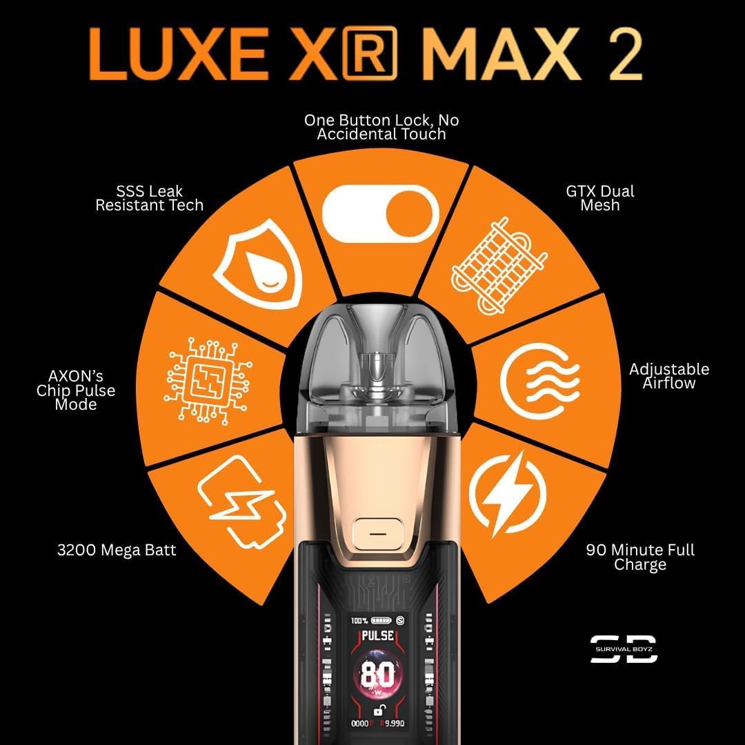 Vaporesso Luxe XR Max 2 Kit è una pod mod dotata di batteria integrata da 3200 mAh e potenza regolabile fino a 80 W, progettata per supportare sia il tiro di guancia (MTL) sia il tiro polmonare (DTL). Il dispositivo integra un display TFT a colori da 0,96" e utilizza chipset AXON con modalità di gestione dell’erogazione Pulse, Eco e Smart.